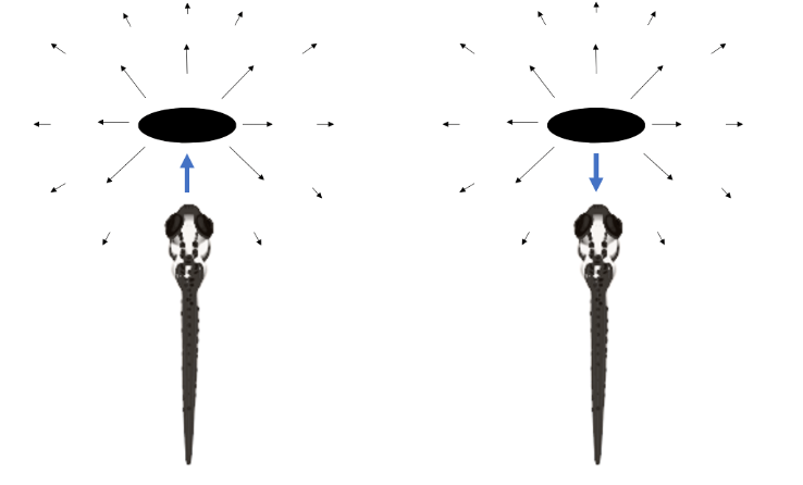 Figure 2. The visual image of an object projected on a larval zebra fish’s retina is nearly identical regardless if the fish is approaching the object, or the object is advancing toward the fish. An ‘efference copy’ is encoded by neurons in the brain to anticipate sensory input generated by self-directed movement, separating actions chosen by the individual from the outside world. Vectors represent optic flow fields, or the pattern of visual motion (think how close objects seem to move faster than distant objects when you gaze out the window of a moving car.)