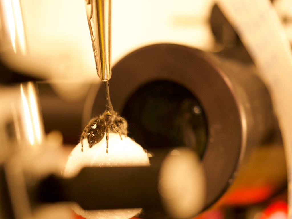 Jumping spiders have elegant, sophisticated, compact, and tightly integrated distributed visual systems. These spiders have eight camera-type (single lens) eyes arranged in four pairs located on the front of their cephalothorax (head). Their visual system is modular: the most forward-facing pair of eyes (principal eyes) is capable of remarkably high spatial resolution and color vision rivaling that of many mammals, while the rest of the eyes (secondary eyes) are hyperacute motion detectors with wide fields of view. First described by Michael Land in 1969, the principal eyes have small moveable (boomerang-shaped) retinas situated at the back of telescope-like tubes inside the head that enable the spider to inspect scenes and objects through saccades and scanning motions, directed by the secondary eyes. (Together, the secondary and principal eyes are functionally analogous to our peripheral and foveal vision.) Jumping spiders are active, diurnal, cat-like predators that visually stalk and pounce on prey, look for mates, and build and return to retreats in sheltered locations; however, our understanding of how jumping spiders use retinal targeting movements to obtain information selectively when exploring their environment or pursuing their behavioral goals is not well understood. Furthermore, our understanding of how jumping spiders process visual information is severely limited because neurophysiological experiments targeting their brains have historically been thwarted by their hydraulic locomotor system and the resulting internal body pressure. Only recently has this constraint been overcome, allowing neural recording techniques to be used in these animals. (For a recent review of what is known about visual processing in jumping spiders, see https://doi.org/10.1016/j.tins.2023.09.002.)